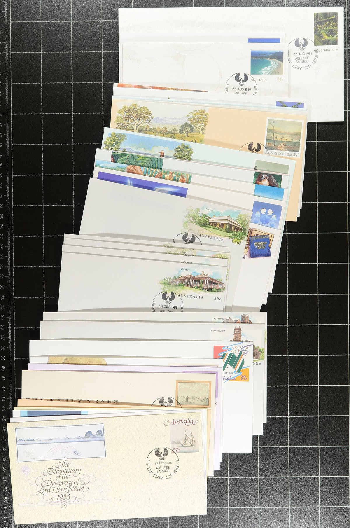 Clean collection of roughly 250 Australia postal stationery with first day cancels, 1980-1997, mostly cacheted and unaddressed and postmarked with the regular Adelaide datestamp along with a few special commemorative cancels. Also includes 5 different Frama-franked cacheted first day covers, as well as 14 different freight link Adelaide to Darwin unaddressed covers. Clean and very fine for the postal stationery specialist. Estimate =