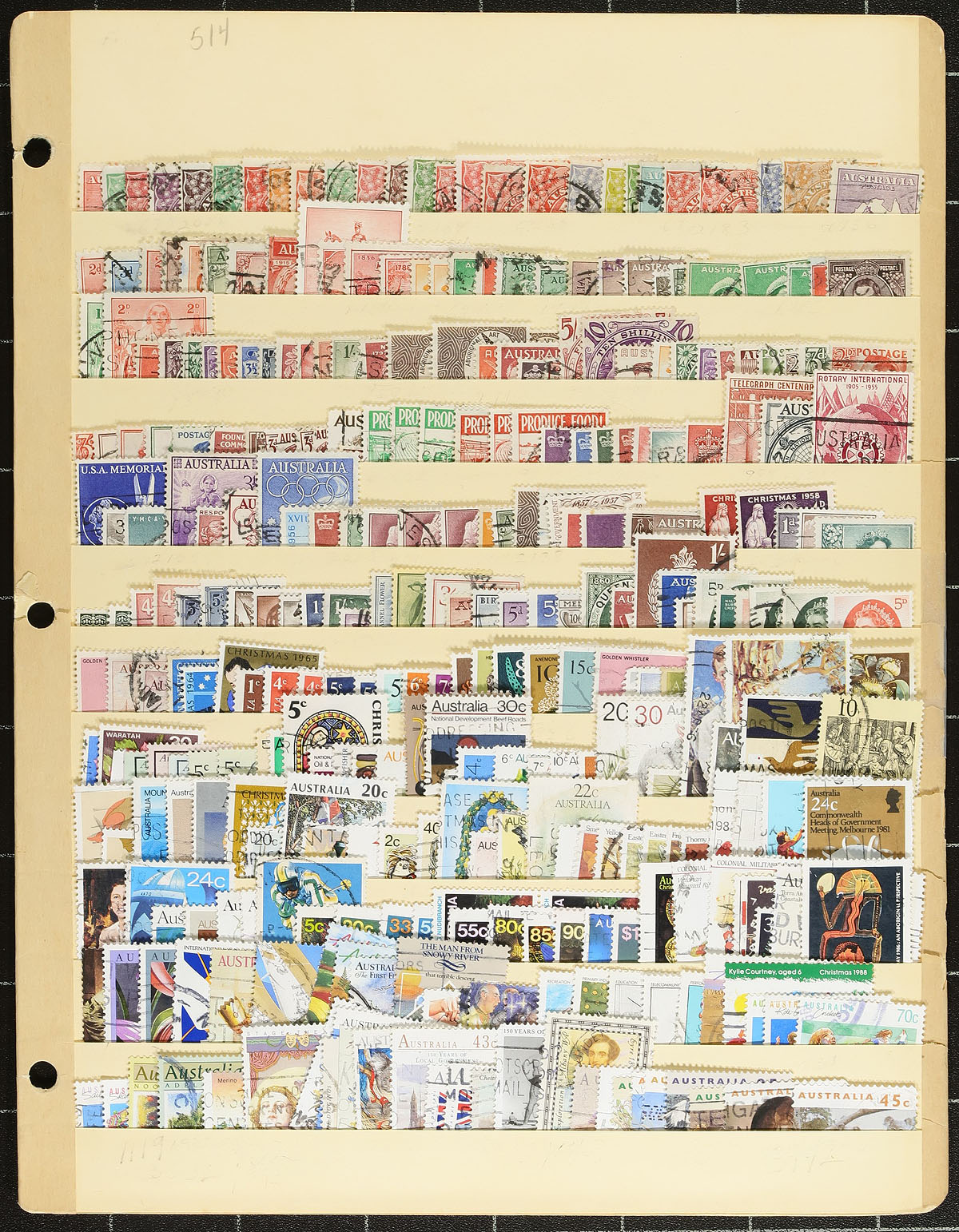 Accumulation of used Australia, 1913-2016, containing over 2,500 stamps in several stock pages and a stockbook. This fairly well organized lot generally ranges from Scott #1/4575, containing a selection of Kangaroos and KGV Heads, modern and back of the book issues, and a few Australian States stamps. A spot check indicated some issues cataloguing $10 to $20 and up. A nice lot with finds for the dedicated collector from this popular collecting country. A few small faults to be expected, overall fine to very fine. Owner's older 2018 Scott US$1,940.00 =