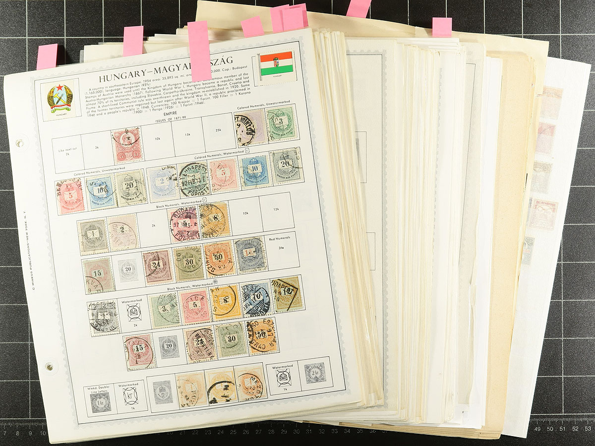 Nice collection / accumulation of primarily used Hungary, 1871-1976, containing roughly 3,000 stamps in over 100 Minkus album or stock pages. This nicely organized lot generally ranges from Scott #3/2403, containing several sets (including mint sets), and back of the book issues. A spot check indicated some items cataloguing $5 to $15 and up, including a few high value occupation stamps (if genuine). Postmark interest includes cds and a few other types, including several 'socked on the nose' town cancels. A nice lot for the Hungary or worldwide collector, overall fine to very fine. Estimate =