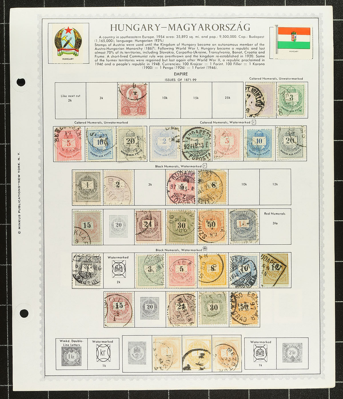 Nice collection / accumulation of primarily used Hungary, 1871-1976, containing roughly 3,000 stamps in over 100 Minkus album or stock pages. This nicely organized lot generally ranges from Scott #3/2403, containing several sets (including mint sets), and back of the book issues. A spot check indicated some items cataloguing $5 to $15 and up, including a few high value occupation stamps (if genuine). Postmark interest includes cds and a few other types, including several 'socked on the nose' town cancels. A nice lot for the Hungary or worldwide collector, overall fine to very fine. Estimate =