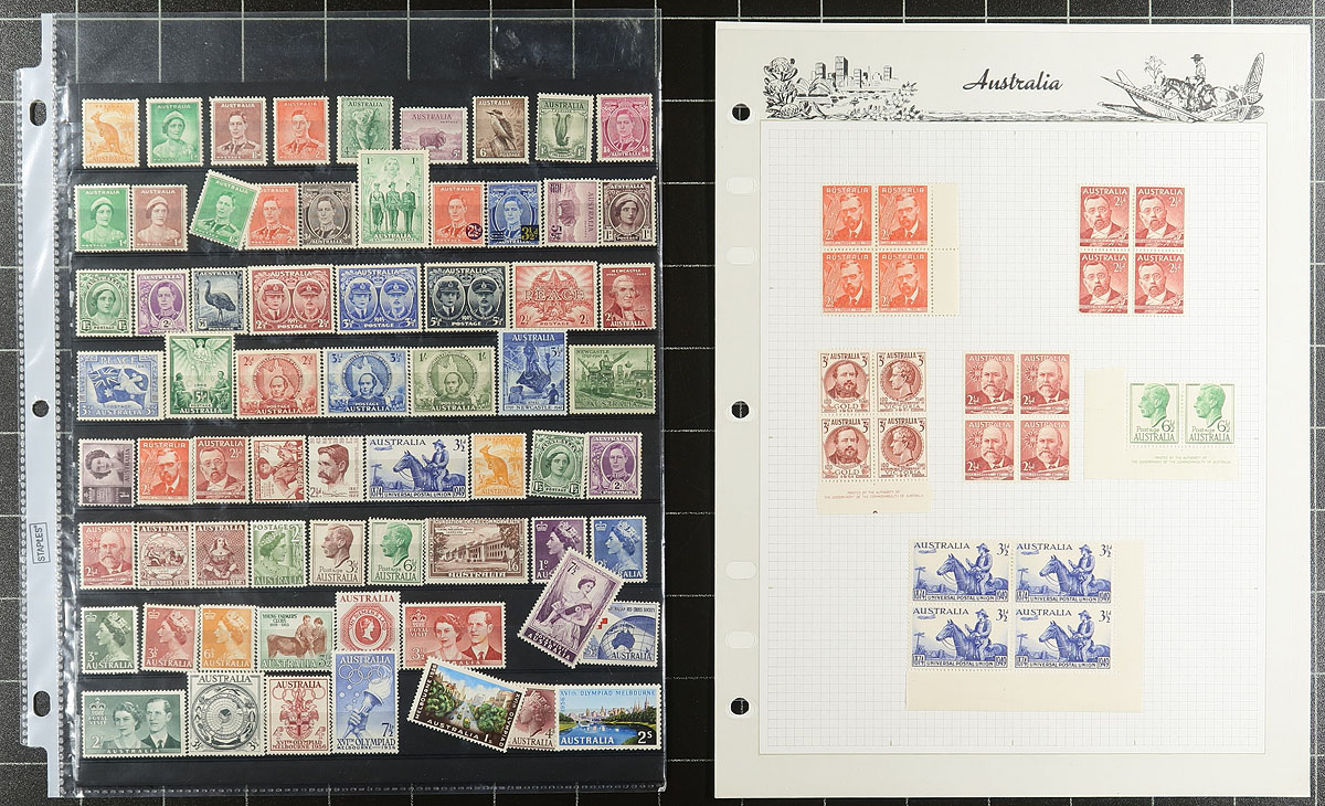 Collection / accumulation of primarily never hinged Australia, 1914-1986, containing several hundreds of stamps in over 17 stock pages. The lot generally ranges from Scott #21/974, containing several sets, blocks, plate blocks, gutter pairs, and back of the book issues. A spot check indicated a few items cataloguing $10 to $20 and up. Mint face value alone is roughly a few hundred dollars. A nice lot for the mint collector from this popular collecting country. Overall fine to very fine. Owner's older 2013 Scott US$1,353.00 =