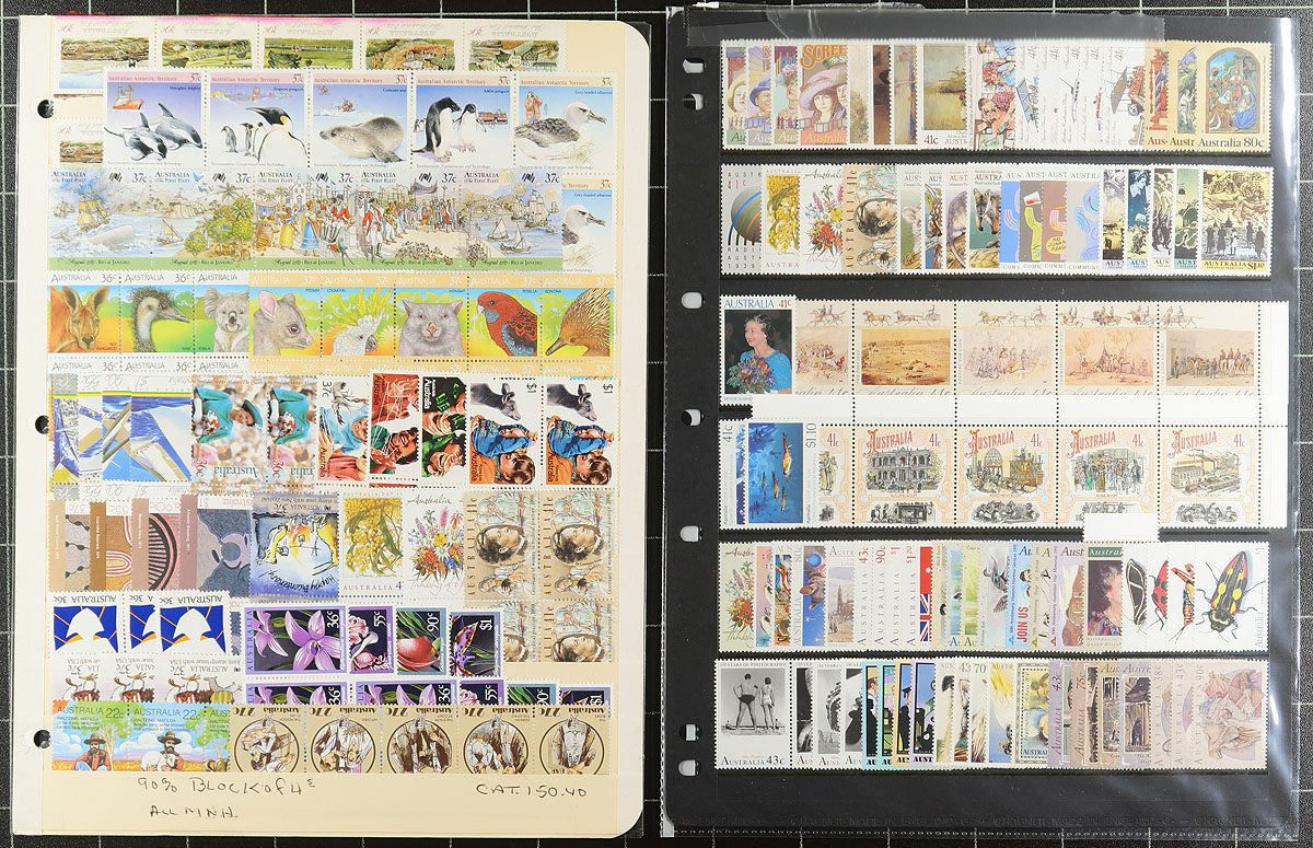 Accumulation of never hinged Australia, 1980's-2003, containing several hundreds of stamps in roughly 12 stock pages. The lot generally ranges from Scott #772/2142, containing several sets, blocks, souvenir sheets, and presentation packs. A spot check indicated some items cataloguing $10 to $15 and up each, with only a portion of the lot catalogued by the owner using a Scott 2018 catalogue totaling $729.00. Face value alone is AUD$575.00. A lovely lot for the Australia or worldwide mint collector, or the postage user. A very fine lot. Estimate =
