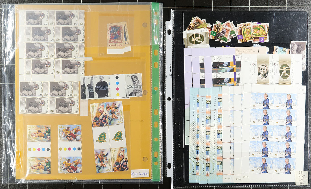 Accumulation of never hinged Australia, 1980's-2003, containing several hundreds of stamps in roughly 12 stock pages. The lot generally ranges from Scott #772/2142, containing several sets, blocks, souvenir sheets, and presentation packs. A spot check indicated some items cataloguing $10 to $15 and up each, with only a portion of the lot catalogued by the owner using a Scott 2018 catalogue totaling $729.00. Face value alone is AUD$575.00. A lovely lot for the Australia or worldwide mint collector, or the postage user. A very fine lot. Estimate =