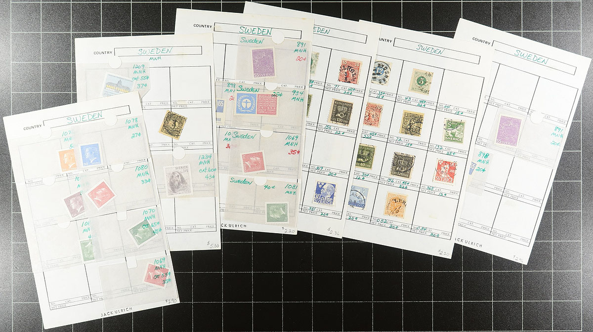 Accumulation of primarily used Sweden, 1970's-1980's, containing many hundreds of stamps in several loose album or stock pages and a binder. The lot is fairly well organized generally ranging from Scott #31/1550a, containing sets, blocks, mint complete booklet panes, and more. A spot check indicated some material ranging from $5 and up, with the owner's 2018 Scott catalogue value totaling US$790.00. A good starter lot that should be continued, overall fine to very fine. Estimate =