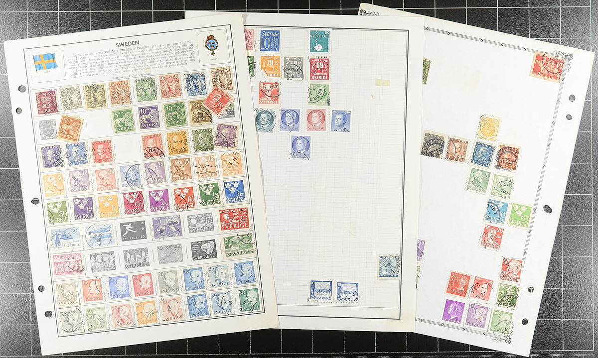 Accumulation of primarily used Sweden, 1970's-1980's, containing many hundreds of stamps in several loose album or stock pages and a binder. The lot is fairly well organized generally ranging from Scott #31/1550a, containing sets, blocks, mint complete booklet panes, and more. A spot check indicated some material ranging from $5 and up, with the owner's 2018 Scott catalogue value totaling US$790.00. A good starter lot that should be continued, overall fine to very fine. Estimate =