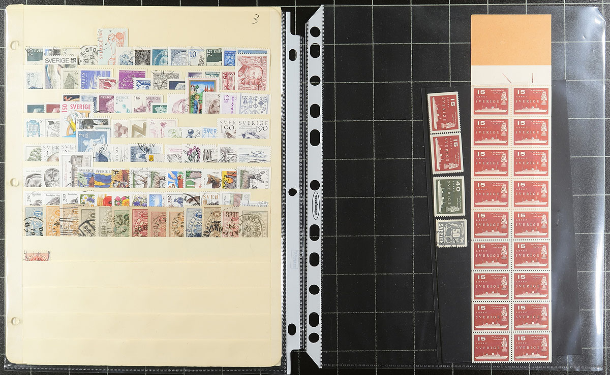 Accumulation of primarily used Sweden, 1970's-1980's, containing many hundreds of stamps in several loose album or stock pages and a binder. The lot is fairly well organized generally ranging from Scott #31/1550a, containing sets, blocks, mint complete booklet panes, and more. A spot check indicated some material ranging from $5 and up, with the owner's 2018 Scott catalogue value totaling US$790.00. A good starter lot that should be continued, overall fine to very fine. Estimate =