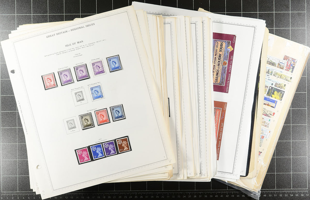 Lovely collection of never hinged Isle of Man, 1958-2009, containing over 1,000 stamps in many hingeless album pages. This nicely organized collection ranges from Scott #1/1318, containing several sets, souvenir sheets, and postage dues. A spot check indicated material cataloging $5 to $10 each, with Scott 2026 catalogue value for the collection totaling UA$1,548.00 ($2089.80 CDN). The lot also includes a package of used, and some mint extras that were not catalogued. A lovely lot for collectors and dealers alike. Estimate =