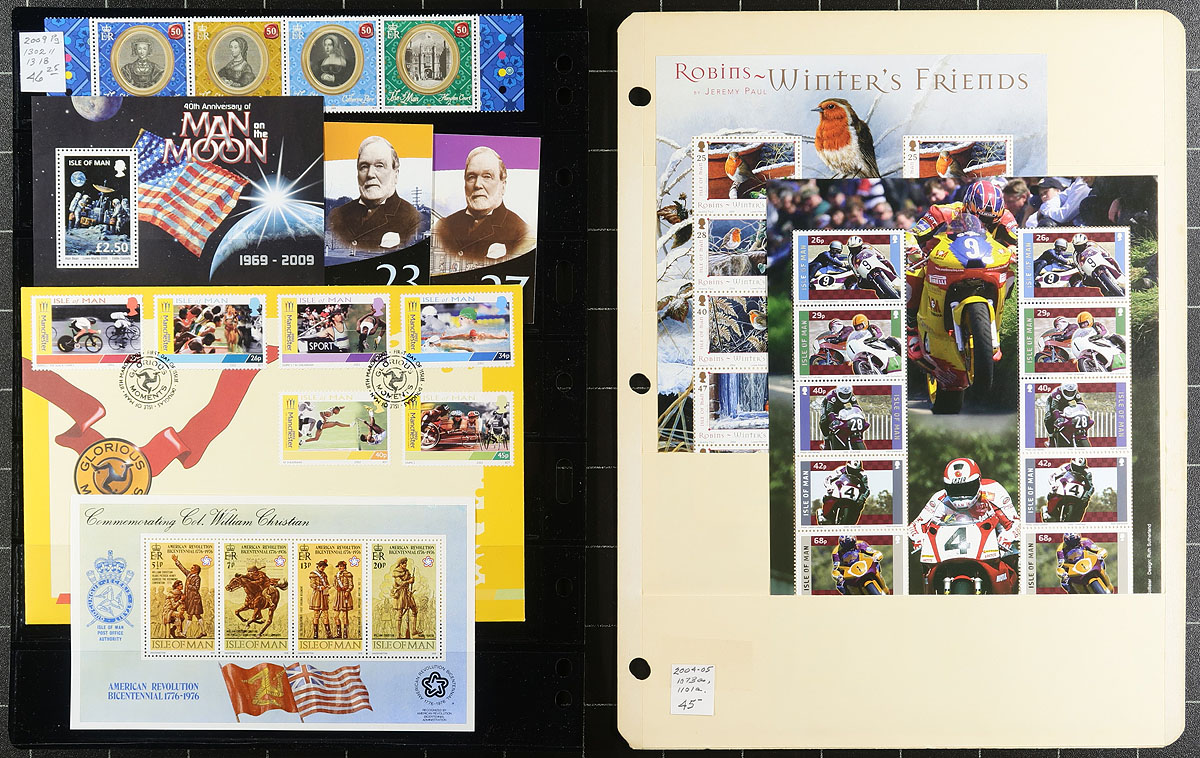 Lovely collection of never hinged Isle of Man, 1958-2009, containing over 1,000 stamps in many hingeless album pages. This nicely organized collection ranges from Scott #1/1318, containing several sets, souvenir sheets, and postage dues. A spot check indicated material cataloging $5 to $10 each, with Scott 2026 catalogue value for the collection totaling UA$1,548.00 ($2089.80 CDN). The lot also includes a package of used, and some mint extras that were not catalogued. A lovely lot for collectors and dealers alike. Estimate =