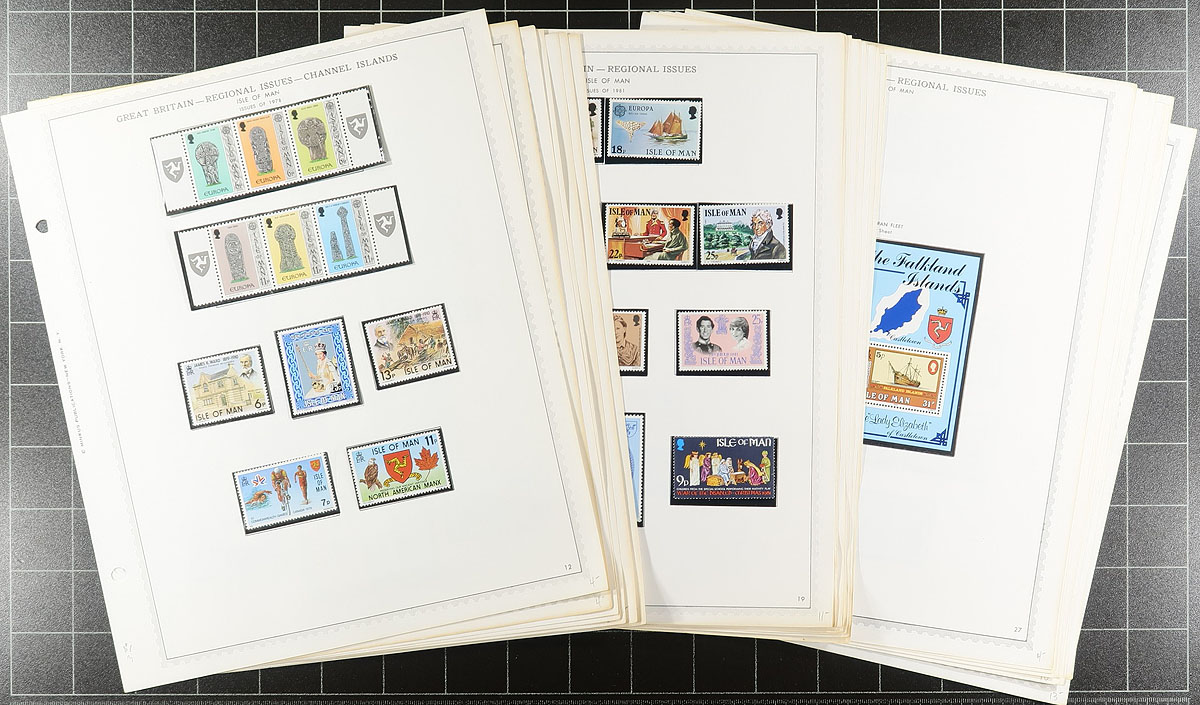 Lovely collection of never hinged Isle of Man, 1958-2009, containing over 1,000 stamps in many hingeless album pages. This nicely organized collection ranges from Scott #1/1318, containing several sets, souvenir sheets, and postage dues. A spot check indicated material cataloging $5 to $10 each, with Scott 2026 catalogue value for the collection totaling UA$1,548.00 ($2089.80 CDN). The lot also includes a package of used, and some mint extras that were not catalogued. A lovely lot for collectors and dealers alike. Estimate =