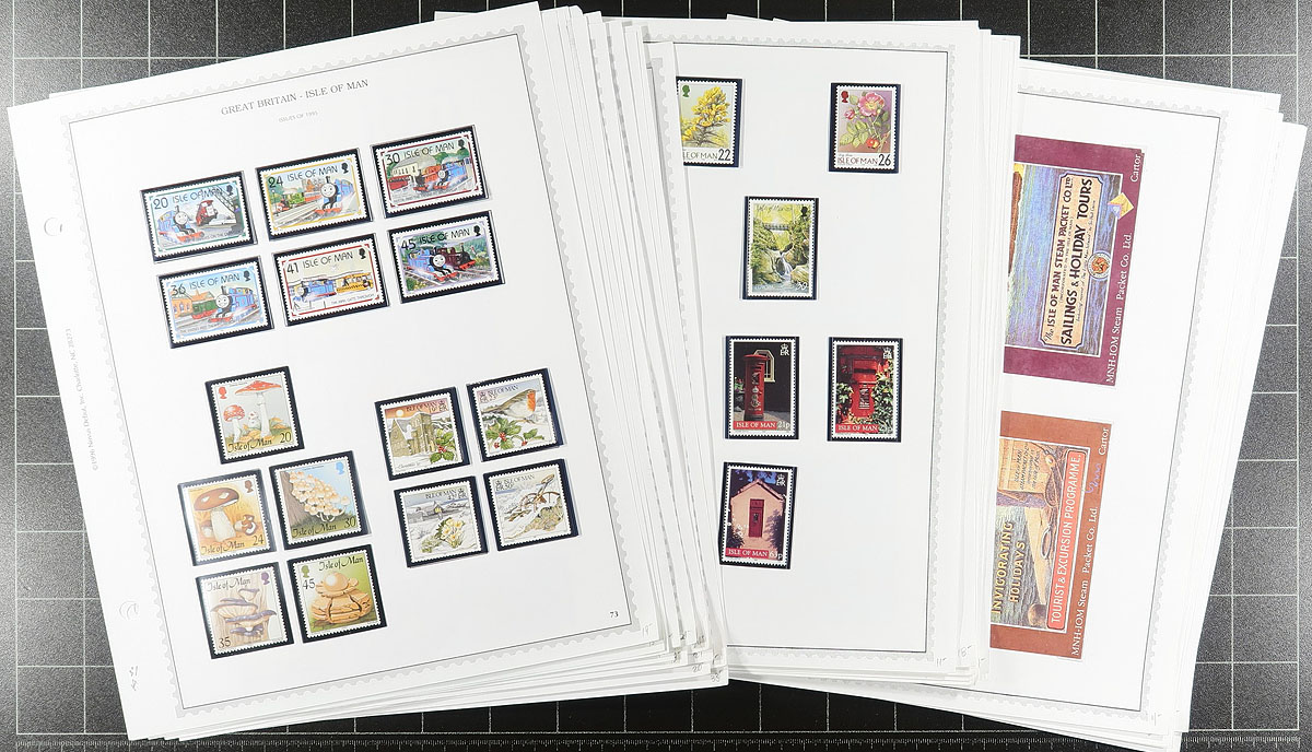 Lovely collection of never hinged Isle of Man, 1958-2009, containing over 1,000 stamps in many hingeless album pages. This nicely organized collection ranges from Scott #1/1318, containing several sets, souvenir sheets, and postage dues. A spot check indicated material cataloging $5 to $10 each, with Scott 2026 catalogue value for the collection totaling UA$1,548.00 ($2089.80 CDN). The lot also includes a package of used, and some mint extras that were not catalogued. A lovely lot for collectors and dealers alike. Estimate =