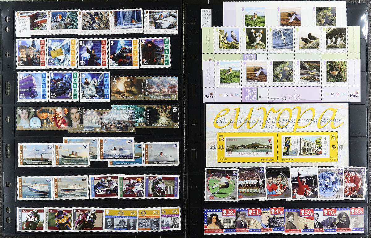 Lovely collection of never hinged Isle of Man, 1958-2009, containing over 1,000 stamps in many hingeless album pages. This nicely organized collection ranges from Scott #1/1318, containing several sets, souvenir sheets, and postage dues. A spot check indicated material cataloging $5 to $10 each, with Scott 2026 catalogue value for the collection totaling UA$1,548.00 ($2089.80 CDN). The lot also includes a package of used, and some mint extras that were not catalogued. A lovely lot for collectors and dealers alike. Estimate =