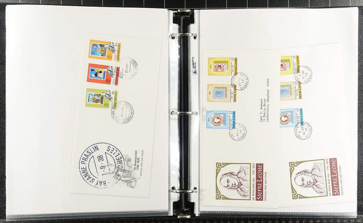 Sir Rowland Hill Centennial Collection, 1879-1979 in four volumes with slipcases. The collection contains roughly 280 worldwide first day covers from 1979, from countries ranging from A (Anguilla) to Z (Zambia), noting singles, sets, and souvenir sheet frankings. A lovely clean lot for collectors and dealers alike. Estimate =