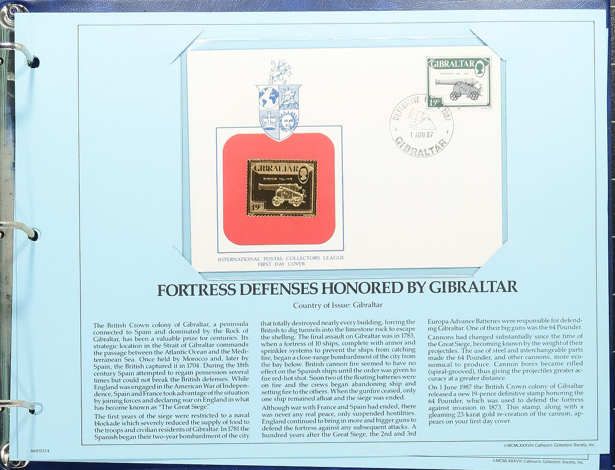 The Royal International Gold Collection First Day Covers, in 5 volumes with slipcases, containing roughly 150 worldwide covers, each having a foil gold replica of the stamp on cover. A nice lot for the cover collector or for topical and thematic folks, noting an original large retail price for the group. Clean and very fine. Estimate =