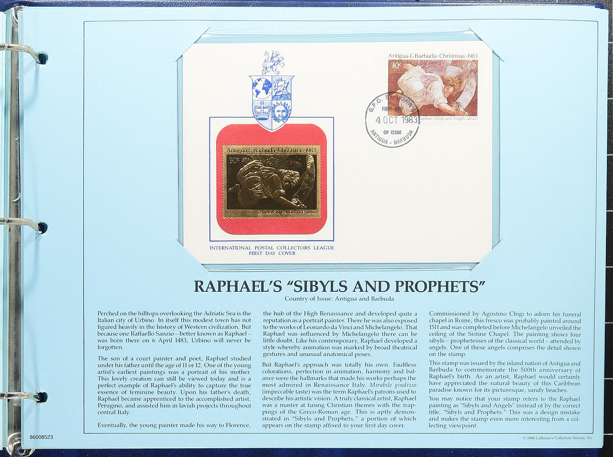 The Royal International Gold Collection First Day Covers, in 5 volumes with slipcases, containing roughly 150 worldwide covers, each having a foil gold replica of the stamp on cover. A nice lot for the cover collector or for topical and thematic folks, noting an original large retail price for the group. Clean and very fine. Estimate =