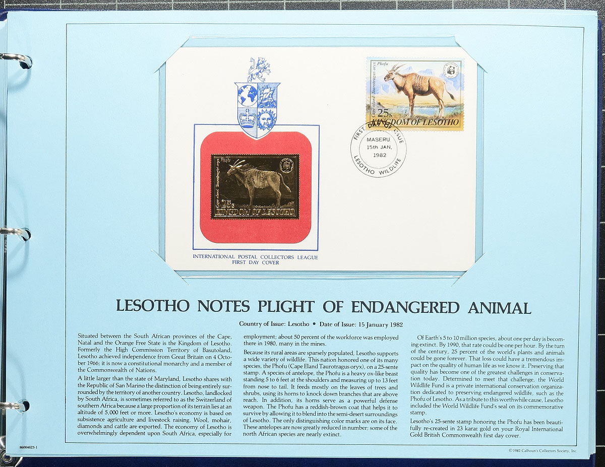 The Royal International Gold Collection First Day Covers, in 5 volumes with slipcases, containing roughly 150 worldwide covers, each having a foil gold replica of the stamp on cover. A nice lot for the cover collector or for topical and thematic folks, noting an original large retail price for the group. Clean and very fine. Estimate =