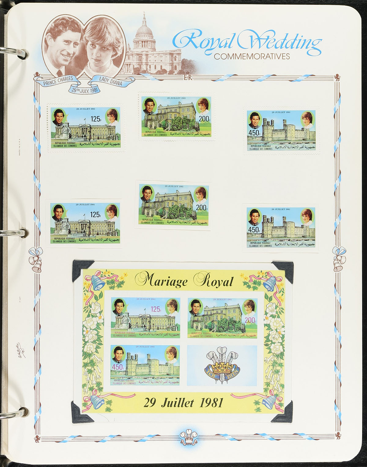 British Commonwealth Topical Collection. Charles and Diana Royal Wedding in 4 volumes (3 with slipcases). The collection includes 3 specially prepared Stanley Gibbons albums, a few hundred stamps containing sets, souvenir sheets, booklets, along with imperforates, and some varieties, from A to G issuing countries. The lot also includes a 4th volume of similar material all relating to the 1981 Royal Wedding. A lovely collection with the owner's older Scott catalogue value at US$530.00 (Stanley Gibbons albums only), making this a nice lot for collectors and dealers alike. Estimate =