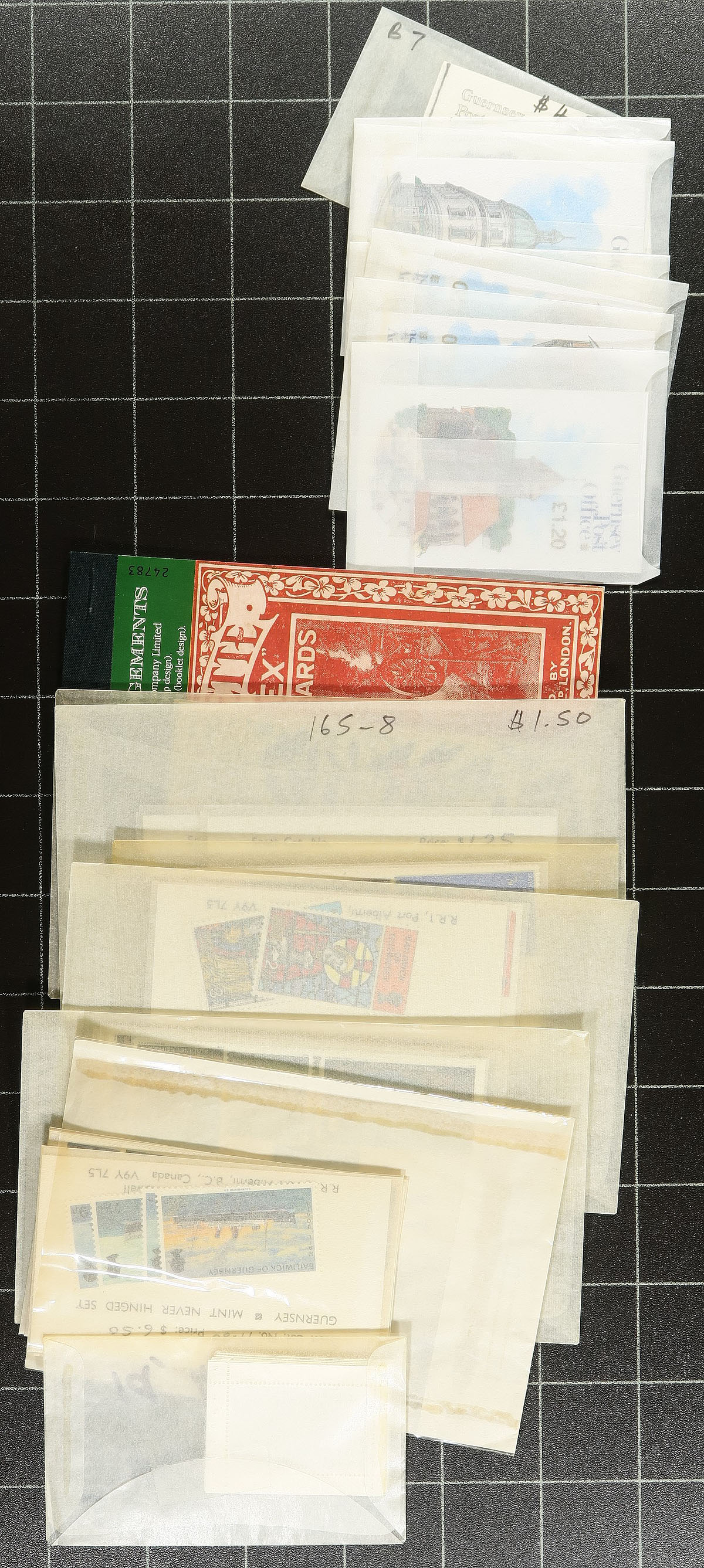 Lovely stock of never hinged Guernsey, 1969-1994, containing a few thousand stamps accumulated in a box. This lovely lot generally ranges from Scott #8/529, containing several sets, souvenir sheets, booklets, and booklet panes, almost all still original post office packaging, or in well identified glassines. Owner's Scott 2013 catalogue value for the lot totals US$2,078.00 ($2805.30 CDN), with face value alone over £500.00. Some duplication throughout, still a nice lot for all collectors and dealers alike. Estimate =