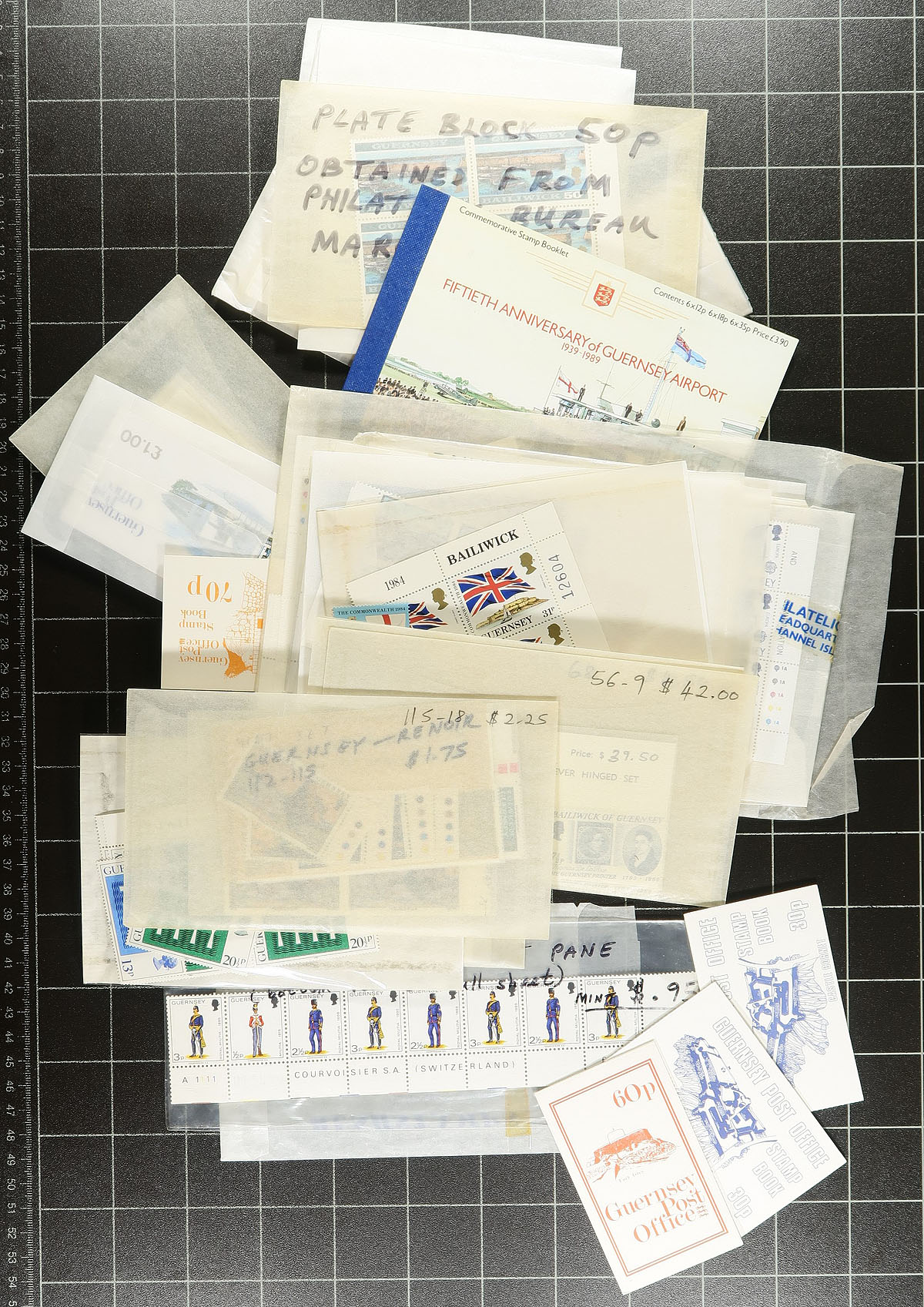 Lovely stock of never hinged Guernsey, 1969-1994, containing a few thousand stamps accumulated in a box. This lovely lot generally ranges from Scott #8/529, containing several sets, souvenir sheets, booklets, and booklet panes, almost all still original post office packaging, or in well identified glassines. Owner's Scott 2013 catalogue value for the lot totals US$2,078.00 ($2805.30 CDN), with face value alone over £500.00. Some duplication throughout, still a nice lot for all collectors and dealers alike. Estimate =