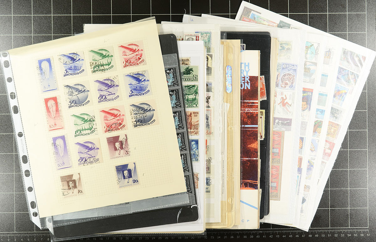 Collection / accumulation of mint and used Russia, 1909-1991, containing over 1,500 stamps in over 20 stock or album pages. The lot generally ranges from Scott #74/6055, containing sets, souvenir sheets, and back of the book material. A cursory check of material indicated some material cataloguing $10 and up including Scott #s 3022-3023 blocks of 12 (used, $96 total, cto cancels), C37-C50, C52 (used, $156 total). Owner's 2013 Scott catalogue value for the lot totals US$1,255.00 ($1,694.25 CDN). A nice lot for collectors, especially topical and thematic collectors as we spotted several suitable subjects. Most of the used appear to have cto cancels, overall fine to very fine. Estimate =