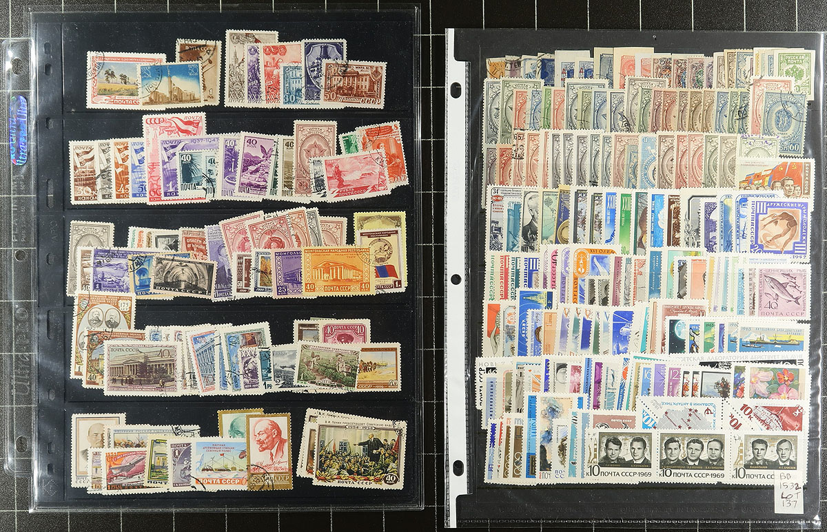 Collection / accumulation of mint and used Russia, 1909-1991, containing over 1,500 stamps in over 20 stock or album pages. The lot generally ranges from Scott #74/6055, containing sets, souvenir sheets, and back of the book material. A cursory check of material indicated some material cataloguing $10 and up including Scott #s 3022-3023 blocks of 12 (used, $96 total, cto cancels), C37-C50, C52 (used, $156 total). Owner's 2013 Scott catalogue value for the lot totals US$1,255.00 ($1,694.25 CDN). A nice lot for collectors, especially topical and thematic collectors as we spotted several suitable subjects. Most of the used appear to have cto cancels, overall fine to very fine. Estimate =