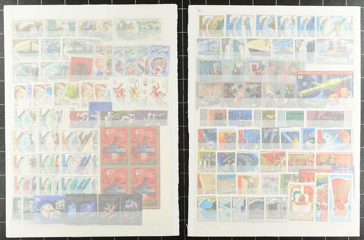 Collection / accumulation of mint and used Russia, 1909-1991, containing over 1,500 stamps in over 20 stock or album pages. The lot generally ranges from Scott #74/6055, containing sets, souvenir sheets, and back of the book material. A cursory check of material indicated some material cataloguing $10 and up including Scott #s 3022-3023 blocks of 12 (used, $96 total, cto cancels), C37-C50, C52 (used, $156 total). Owner's 2013 Scott catalogue value for the lot totals US$1,255.00 ($1,694.25 CDN). A nice lot for collectors, especially topical and thematic collectors as we spotted several suitable subjects. Most of the used appear to have cto cancels, overall fine to very fine. Estimate =