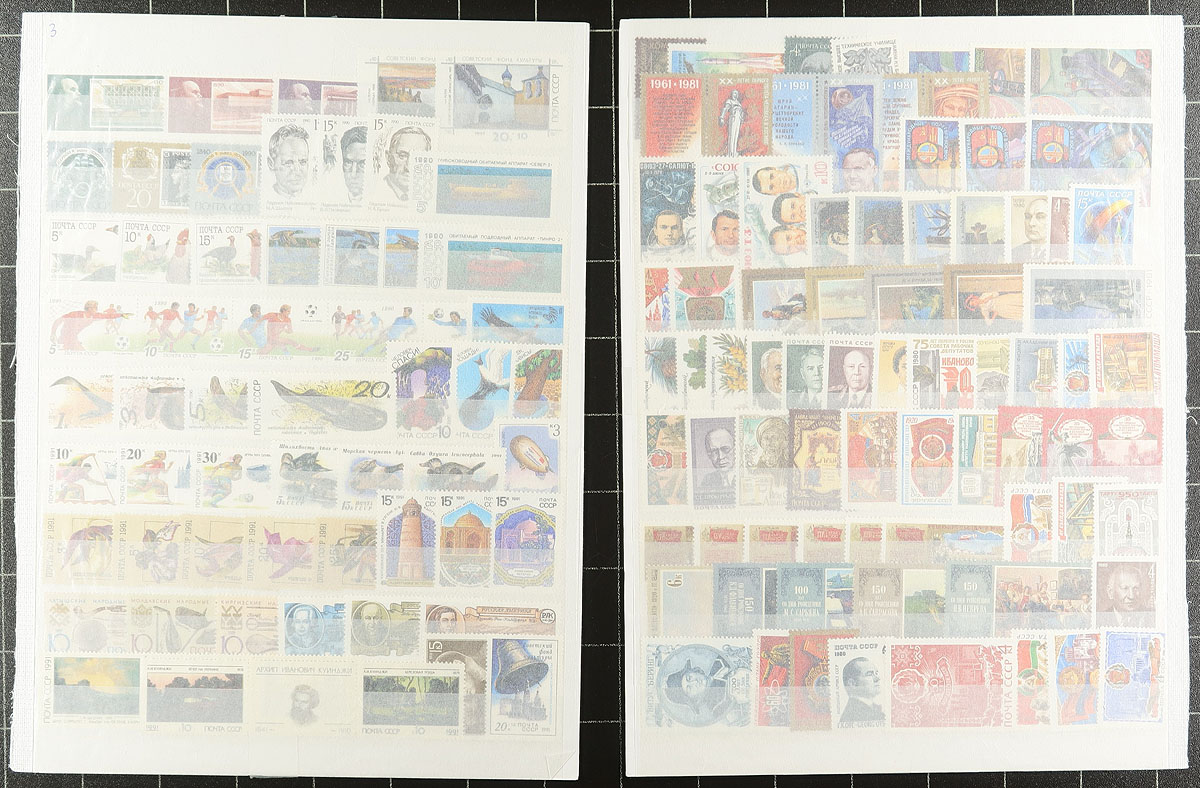 Collection / accumulation of mint and used Russia, 1909-1991, containing over 1,500 stamps in over 20 stock or album pages. The lot generally ranges from Scott #74/6055, containing sets, souvenir sheets, and back of the book material. A cursory check of material indicated some material cataloguing $10 and up including Scott #s 3022-3023 blocks of 12 (used, $96 total, cto cancels), C37-C50, C52 (used, $156 total). Owner's 2013 Scott catalogue value for the lot totals US$1,255.00 ($1,694.25 CDN). A nice lot for collectors, especially topical and thematic collectors as we spotted several suitable subjects. Most of the used appear to have cto cancels, overall fine to very fine. Estimate =