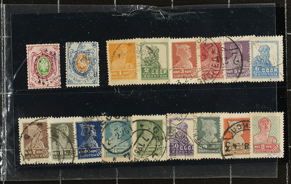 Collection / accumulation of mint and used Russia, 1909-1991, containing over 1,500 stamps in over 20 stock or album pages. The lot generally ranges from Scott #74/6055, containing sets, souvenir sheets, and back of the book material. A cursory check of material indicated some material cataloguing $10 and up including Scott #s 3022-3023 blocks of 12 (used, $96 total, cto cancels), C37-C50, C52 (used, $156 total). Owner's 2013 Scott catalogue value for the lot totals US$1,255.00 ($1,694.25 CDN). A nice lot for collectors, especially topical and thematic collectors as we spotted several suitable subjects. Most of the used appear to have cto cancels, overall fine to very fine. Estimate =