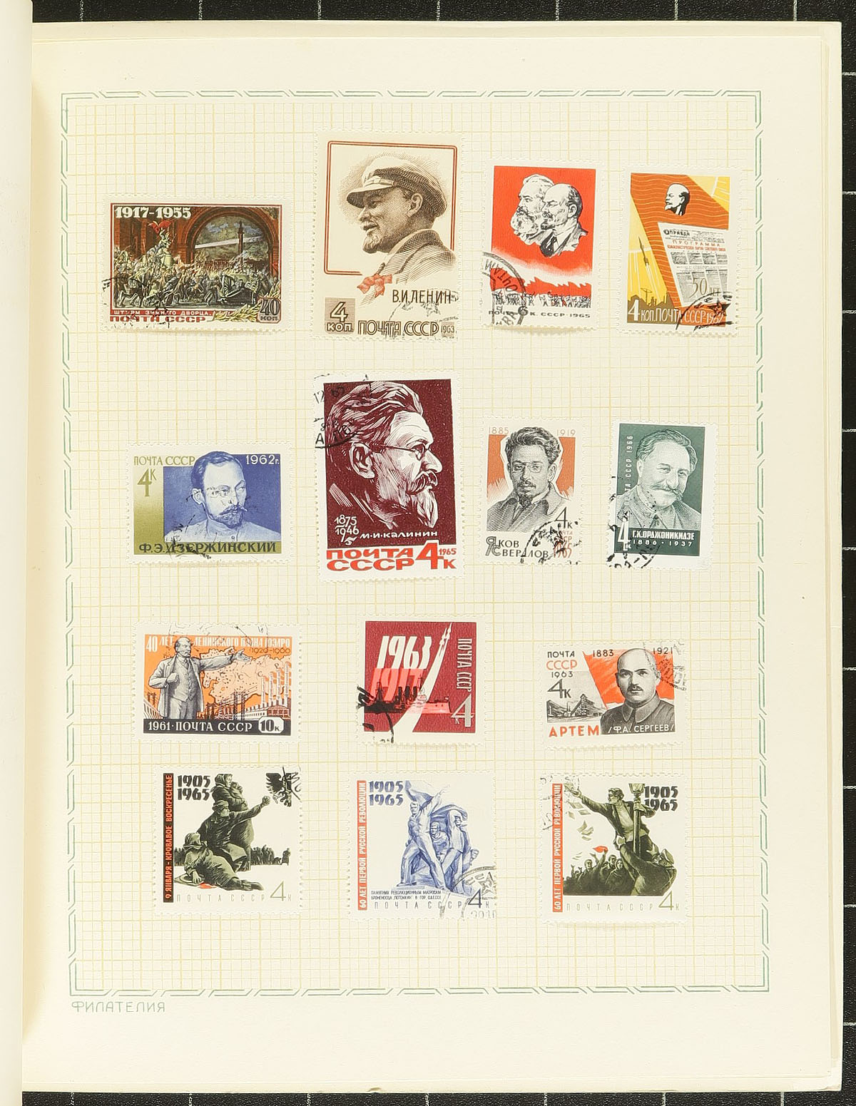 Collection / accumulation of mint and used Russia, 1909-1991, containing over 1,500 stamps in over 20 stock or album pages. The lot generally ranges from Scott #74/6055, containing sets, souvenir sheets, and back of the book material. A cursory check of material indicated some material cataloguing $10 and up including Scott #s 3022-3023 blocks of 12 (used, $96 total, cto cancels), C37-C50, C52 (used, $156 total). Owner's 2013 Scott catalogue value for the lot totals US$1,255.00 ($1,694.25 CDN). A nice lot for collectors, especially topical and thematic collectors as we spotted several suitable subjects. Most of the used appear to have cto cancels, overall fine to very fine. Estimate =
