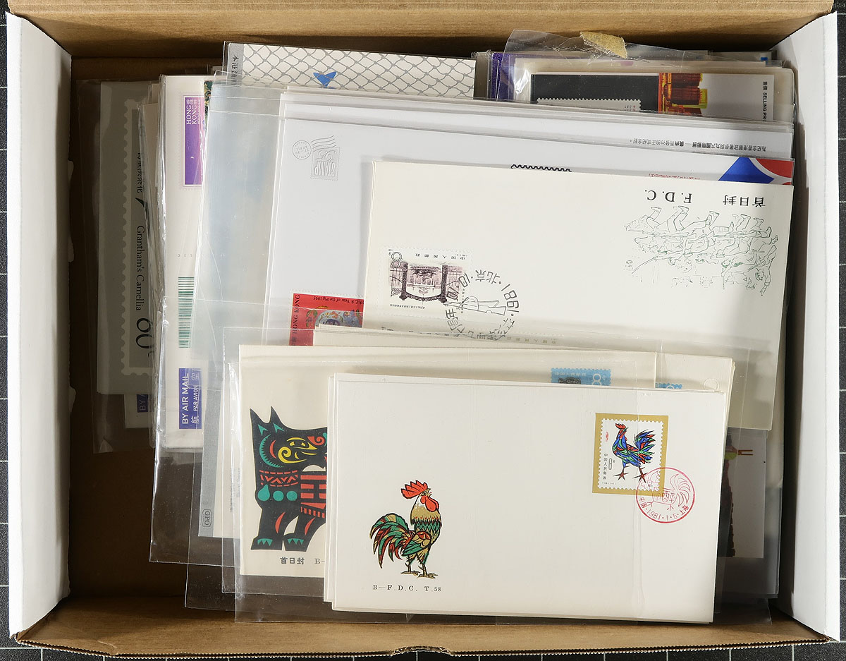 Accumulation of roughly 200 first day covers and postcards, 1980's-2000. This clean lot includes roughly 150 Hong Kong prepaid postcards, many still in the original packing, noting a few different postcard series with an original price totaling $925.00 Hong Kong dollars, along with a mixture of Hong Kong and People's Republic of China first day covers, including a few lunar new year issues from 1981 and 1982, with a few items cataloguing $5 and up. Duplication ranges from 5 to 10 per issue, still a very clean lot ideal for collectors and dealers alike. Estimate =