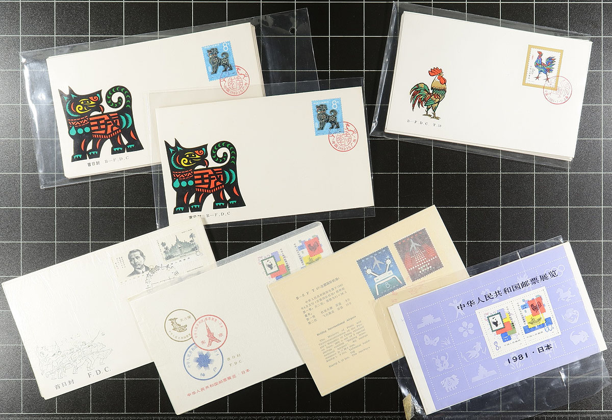 Accumulation of roughly 200 first day covers and postcards, 1980's-2000. This clean lot includes roughly 150 Hong Kong prepaid postcards, many still in the original packing, noting a few different postcard series with an original price totaling $925.00 Hong Kong dollars, along with a mixture of Hong Kong and People's Republic of China first day covers, including a few lunar new year issues from 1981 and 1982, with a few items cataloguing $5 and up. Duplication ranges from 5 to 10 per issue, still a very clean lot ideal for collectors and dealers alike. Estimate =