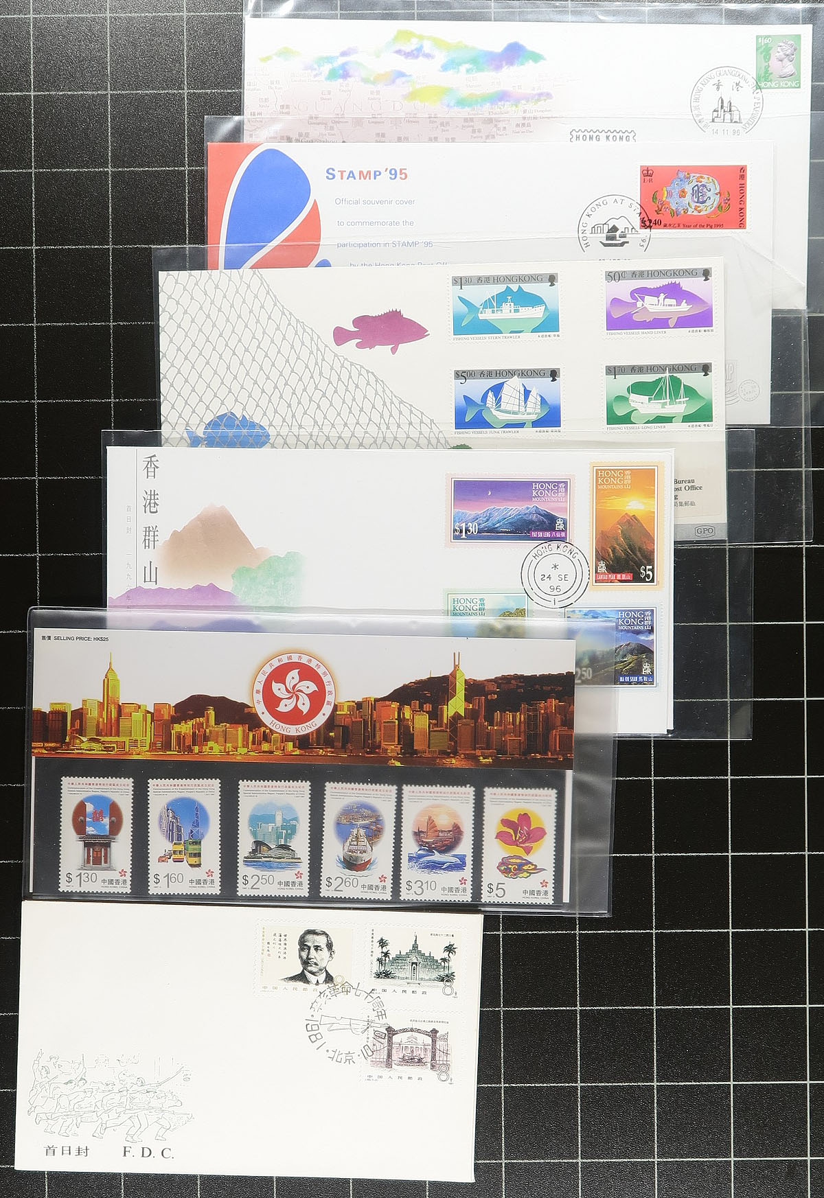 Accumulation of roughly 200 first day covers and postcards, 1980's-2000. This clean lot includes roughly 150 Hong Kong prepaid postcards, many still in the original packing, noting a few different postcard series with an original price totaling $925.00 Hong Kong dollars, along with a mixture of Hong Kong and People's Republic of China first day covers, including a few lunar new year issues from 1981 and 1982, with a few items cataloguing $5 and up. Duplication ranges from 5 to 10 per issue, still a very clean lot ideal for collectors and dealers alike. Estimate =