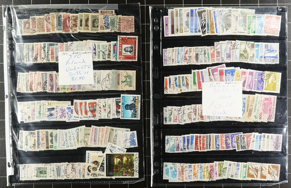 Europea accumulations of several thousands of primarily used stamps from European countries. The lot consists of material from Poland, Romania, Czechoslovakia, Bulgaria, Germany, and the Netherlands, generally ranging from the 1890's to the 1970's, in a few hundred album, manilla, or stock pages. Most of the material has been catalogued by the owner using a 2009 Scott catalogue value totals US$1,051.00 ($1418.85 CDN), leaving better finds for the dedicated collector. A nice large lot for the worldwide collector, overall fine to very fine. Estimate =