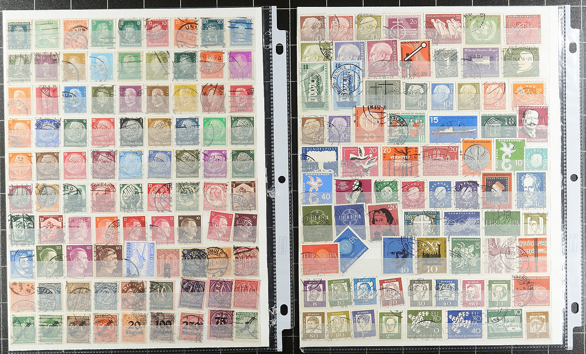 Nice collection / accumulation of used Germany, 1875-2008, containing over 2,000 stamps on over 100 album or stock pages. This fairly organized lot generally ranges from Scott #31/2494, containing sets, semi-postals, and other back of the book issues, along with some Berlin and perhaps DDR material. The majority of the lot is found within the stock pages, and continues with a nice run of stamps from the 1980s to the 1990s in several KABE album pages. Owner's 2018 Scott catalogue value for the lot totals US$2,239.00 ($3,022.65 CDN), leaving better finds to the dedicated collector. A nice lot, with a few small faults noted with a few earlier issues, overall fine to very fine. Estimate =