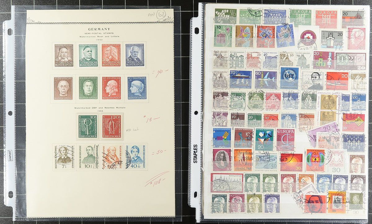Nice collection / accumulation of used Germany, 1875-2008, containing over 2,000 stamps on over 100 album or stock pages. This fairly organized lot generally ranges from Scott #31/2494, containing sets, semi-postals, and other back of the book issues, along with some Berlin and perhaps DDR material. The majority of the lot is found within the stock pages, and continues with a nice run of stamps from the 1980s to the 1990s in several KABE album pages. Owner's 2018 Scott catalogue value for the lot totals US$2,239.00 ($3,022.65 CDN), leaving better finds to the dedicated collector. A nice lot, with a few small faults noted with a few earlier issues, overall fine to very fine. Estimate =