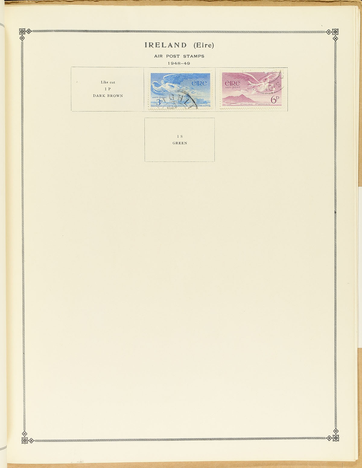 Collection / accumulation of primarily used Ireland, 1922-2010, containing over 1,700 stamps in roughly 20 stock or album pages. The lot generally ranges from Scott #1/1873, containing sets, airmails and other back of the book issues. A spot check a few singles and sets cataloguing $10 and up each. Owner's 2009 Scott catalogue value for the lot totals US$1,374.00 ($1,854.90 CDN), leaving better finds for the dedicated collector. A nice lot for the Ireland or worldwide collector, overall fine to very fine. Estimate =