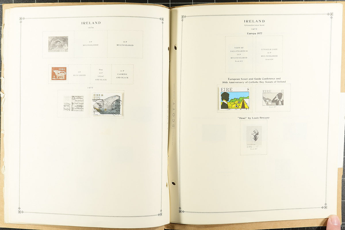 Collection / accumulation of primarily used Ireland, 1922-2010, containing over 1,700 stamps in roughly 20 stock or album pages. The lot generally ranges from Scott #1/1873, containing sets, airmails and other back of the book issues. A spot check a few singles and sets cataloguing $10 and up each. Owner's 2009 Scott catalogue value for the lot totals US$1,374.00 ($1,854.90 CDN), leaving better finds for the dedicated collector. A nice lot for the Ireland or worldwide collector, overall fine to very fine. Estimate =