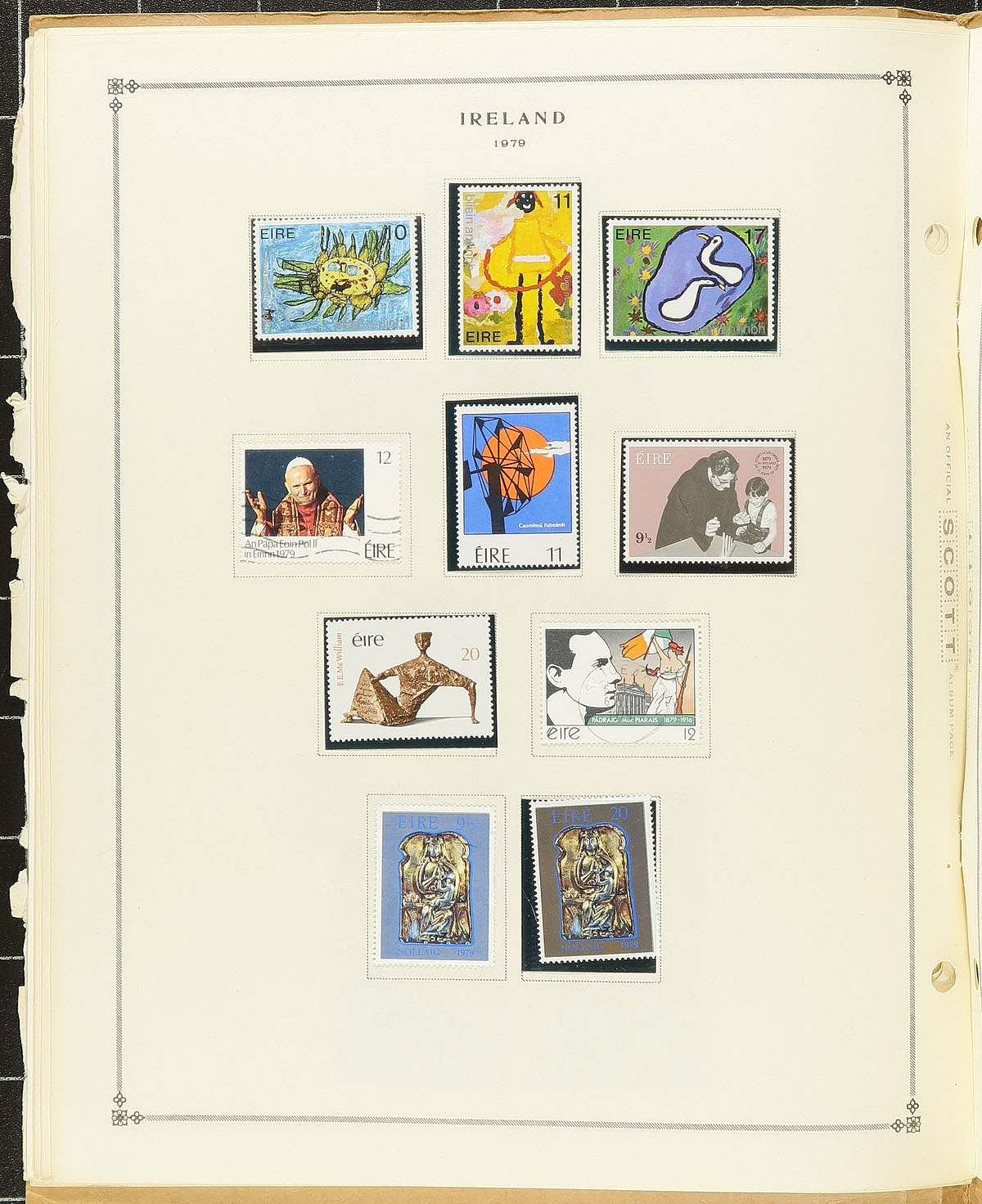 Collection / accumulation of primarily used Ireland, 1922-2010, containing over 1,700 stamps in roughly 20 stock or album pages. The lot generally ranges from Scott #1/1873, containing sets, airmails and other back of the book issues. A spot check a few singles and sets cataloguing $10 and up each. Owner's 2009 Scott catalogue value for the lot totals US$1,374.00 ($1,854.90 CDN), leaving better finds for the dedicated collector. A nice lot for the Ireland or worldwide collector, overall fine to very fine. Estimate =
