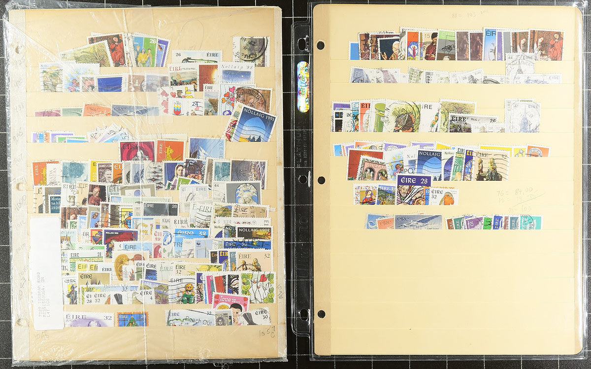 Collection / accumulation of primarily used Ireland, 1922-2010, containing over 1,700 stamps in roughly 20 stock or album pages. The lot generally ranges from Scott #1/1873, containing sets, airmails and other back of the book issues. A spot check a few singles and sets cataloguing $10 and up each. Owner's 2009 Scott catalogue value for the lot totals US$1,374.00 ($1,854.90 CDN), leaving better finds for the dedicated collector. A nice lot for the Ireland or worldwide collector, overall fine to very fine. Estimate =