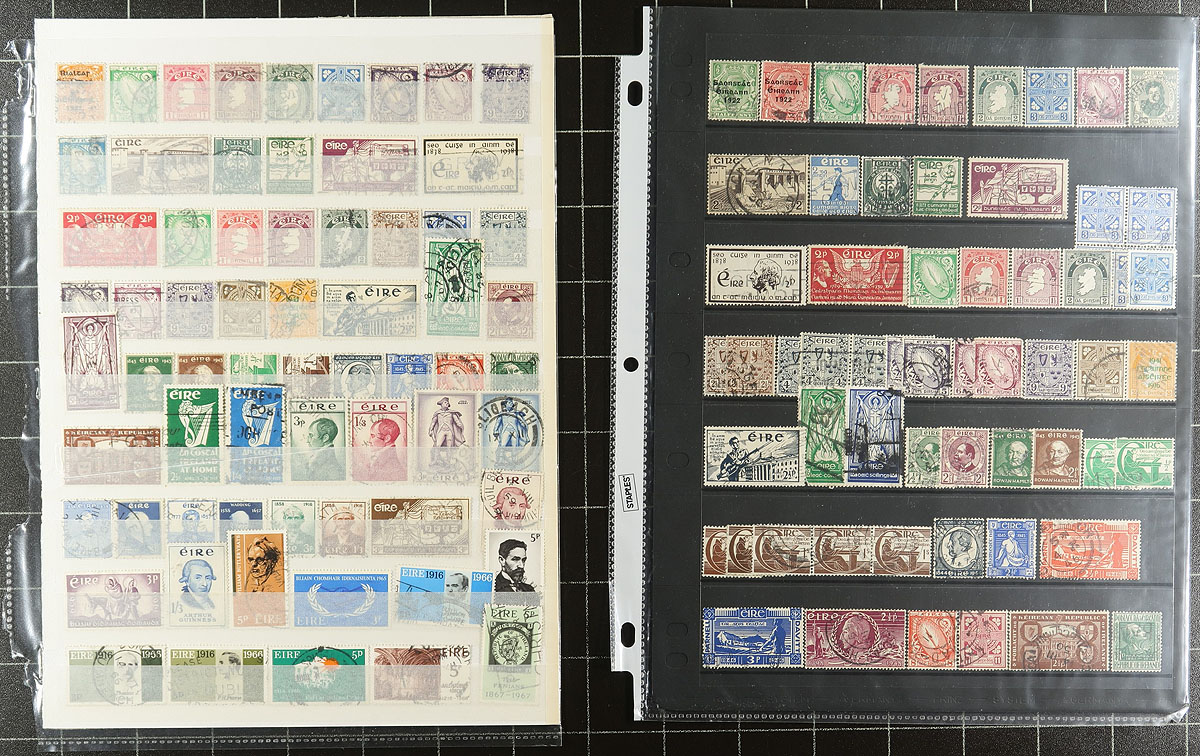 Collection / accumulation of primarily used Ireland, 1922-2010, containing over 1,700 stamps in roughly 20 stock or album pages. The lot generally ranges from Scott #1/1873, containing sets, airmails and other back of the book issues. A spot check a few singles and sets cataloguing $10 and up each. Owner's 2009 Scott catalogue value for the lot totals US$1,374.00 ($1,854.90 CDN), leaving better finds for the dedicated collector. A nice lot for the Ireland or worldwide collector, overall fine to very fine. Estimate =