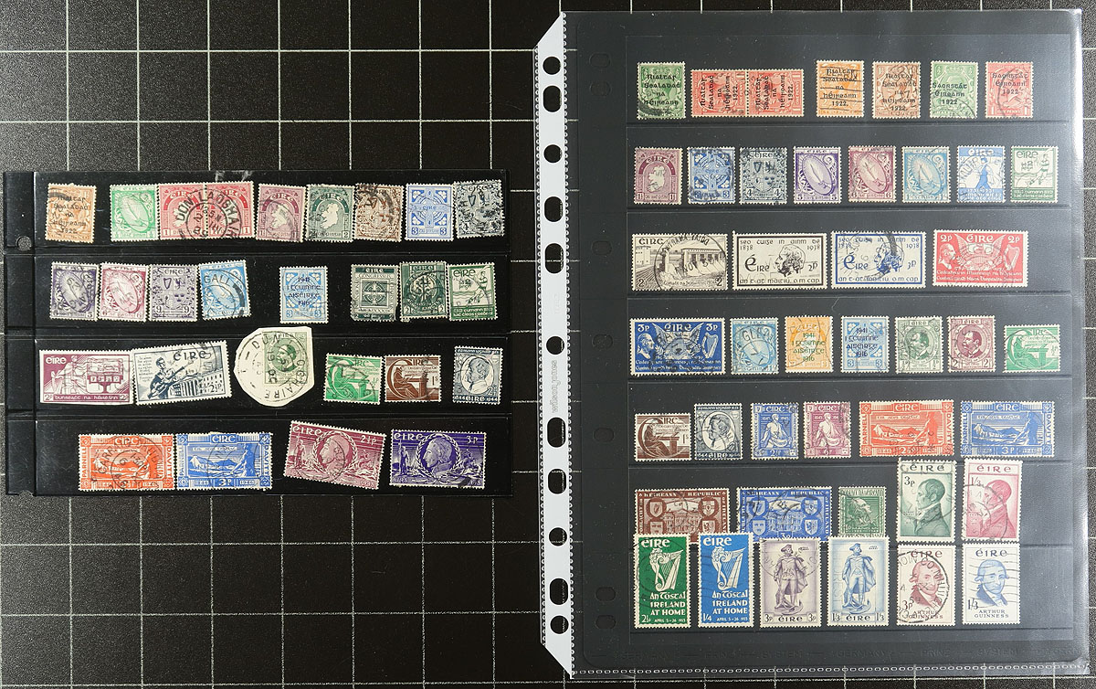 Collection / accumulation of primarily used Ireland, 1922-2010, containing over 1,700 stamps in roughly 20 stock or album pages. The lot generally ranges from Scott #1/1873, containing sets, airmails and other back of the book issues. A spot check a few singles and sets cataloguing $10 and up each. Owner's 2009 Scott catalogue value for the lot totals US$1,374.00 ($1,854.90 CDN), leaving better finds for the dedicated collector. A nice lot for the Ireland or worldwide collector, overall fine to very fine. Estimate =