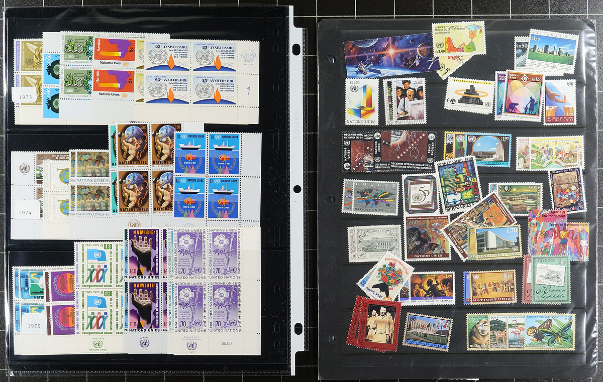 Collection of primarily never hinged United Nations, 1951-1998, containing over 1,200 stamps in two albums and a few stock pages. The lot contains material from all 3 offices noting singles, sets, blocks, plate blocks, presentation packs and a few annual collections. A spot check indicated some material cataloguing $10 and up, with the owner's 2012 Scott catalogue value for the lot totals at least US$964.00. A nice clean lot for collectors, especially thematic and topical specialists as we encountered several suitable subjects. Clean and very fine. Estimate =