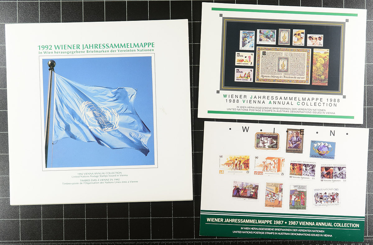 Collection of primarily never hinged United Nations, 1951-1998, containing over 1,200 stamps in two albums and a few stock pages. The lot contains material from all 3 offices noting singles, sets, blocks, plate blocks, presentation packs and a few annual collections. A spot check indicated some material cataloguing $10 and up, with the owner's 2012 Scott catalogue value for the lot totals at least US$964.00. A nice clean lot for collectors, especially thematic and topical specialists as we encountered several suitable subjects. Clean and very fine. Estimate =