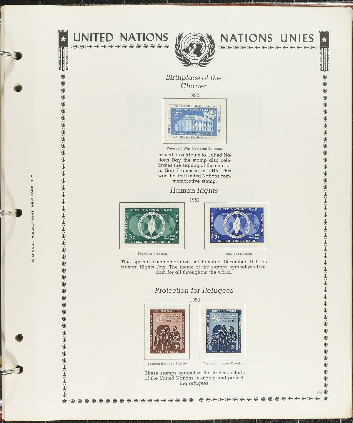 Collection of primarily never hinged United Nations, 1951-1998, containing over 1,200 stamps in two albums and a few stock pages. The lot contains material from all 3 offices noting singles, sets, blocks, plate blocks, presentation packs and a few annual collections. A spot check indicated some material cataloguing $10 and up, with the owner's 2012 Scott catalogue value for the lot totals at least US$964.00. A nice clean lot for collectors, especially thematic and topical specialists as we encountered several suitable subjects. Clean and very fine. Estimate =