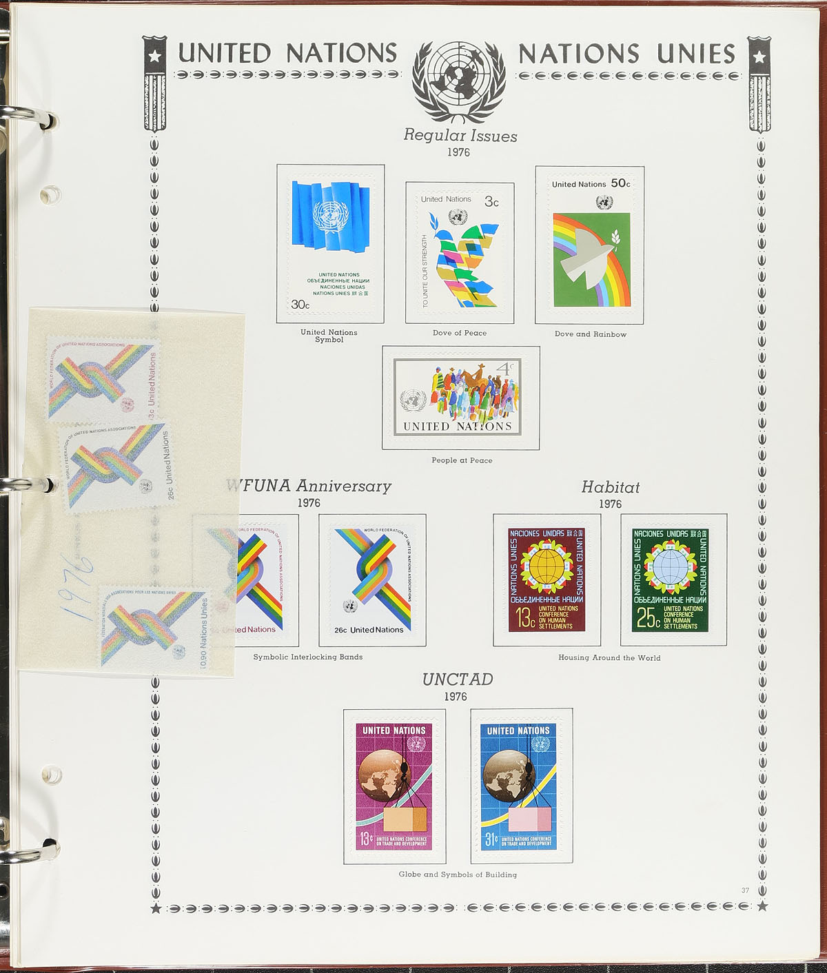 Collection of primarily never hinged United Nations, 1951-1998, containing over 1,200 stamps in two albums and a few stock pages. The lot contains material from all 3 offices noting singles, sets, blocks, plate blocks, presentation packs and a few annual collections. A spot check indicated some material cataloguing $10 and up, with the owner's 2012 Scott catalogue value for the lot totals at least US$964.00. A nice clean lot for collectors, especially thematic and topical specialists as we encountered several suitable subjects. Clean and very fine. Estimate =