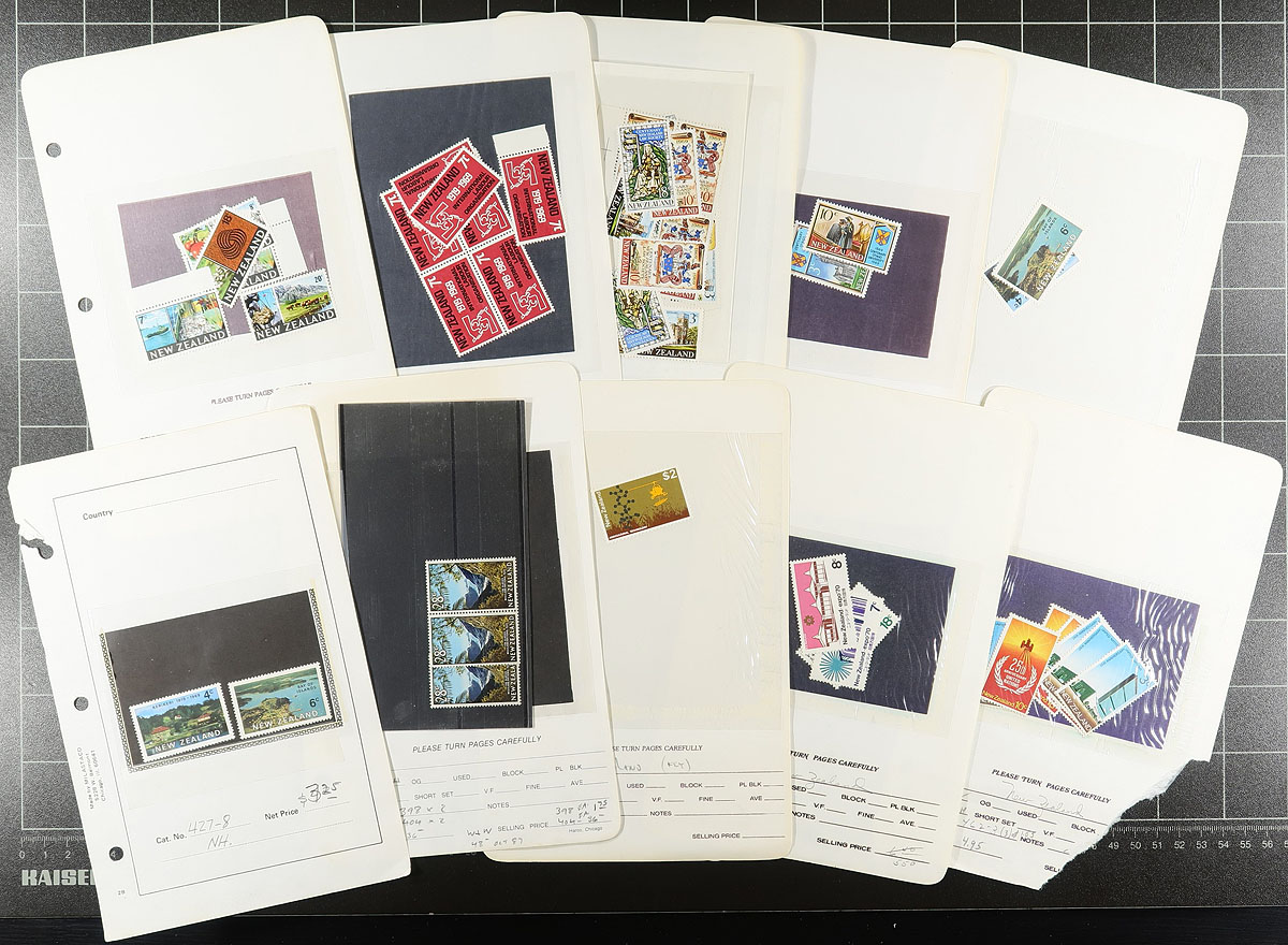 Lovely accumulation of primarily never hinged New Zealand, 1960's-1990's, containing many hundreds of stamps in glassines, dealer pages, and loose in plastic baggies. This very nice lot generally ranges from SCott #340c/1398, containing mostly blocks, sets, and partial sets, with a spot check indicating some material cataloguing $10 and up each. Owner's 2017 Scott catalogue value for the lot totals US$1,699.00 ($2,293.65 CDN), face value alone should be several hundreds of dollars. A nice lot for collectors or dealers looking for stock. Clean and very fine. Estimate =