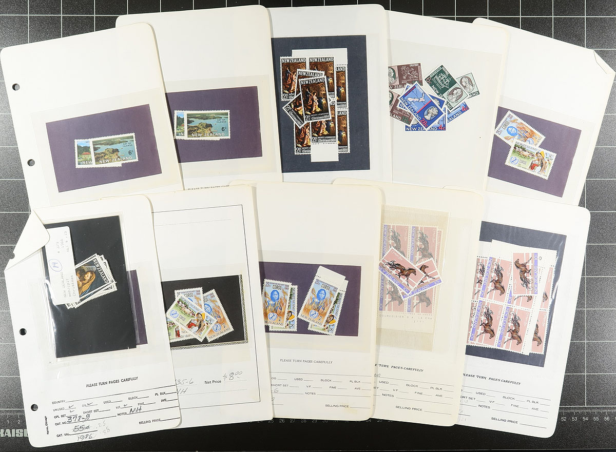 Lovely accumulation of primarily never hinged New Zealand, 1960's-1990's, containing many hundreds of stamps in glassines, dealer pages, and loose in plastic baggies. This very nice lot generally ranges from SCott #340c/1398, containing mostly blocks, sets, and partial sets, with a spot check indicating some material cataloguing $10 and up each. Owner's 2017 Scott catalogue value for the lot totals US$1,699.00 ($2,293.65 CDN), face value alone should be several hundreds of dollars. A nice lot for collectors or dealers looking for stock. Clean and very fine. Estimate =