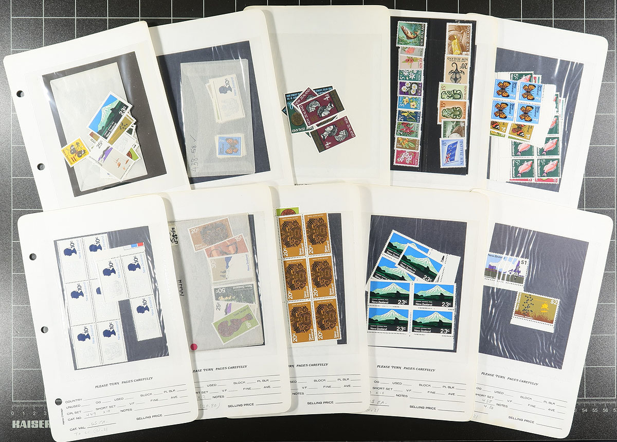 Lovely accumulation of primarily never hinged New Zealand, 1960's-1990's, containing many hundreds of stamps in glassines, dealer pages, and loose in plastic baggies. This very nice lot generally ranges from SCott #340c/1398, containing mostly blocks, sets, and partial sets, with a spot check indicating some material cataloguing $10 and up each. Owner's 2017 Scott catalogue value for the lot totals US$1,699.00 ($2,293.65 CDN), face value alone should be several hundreds of dollars. A nice lot for collectors or dealers looking for stock. Clean and very fine. Estimate =
