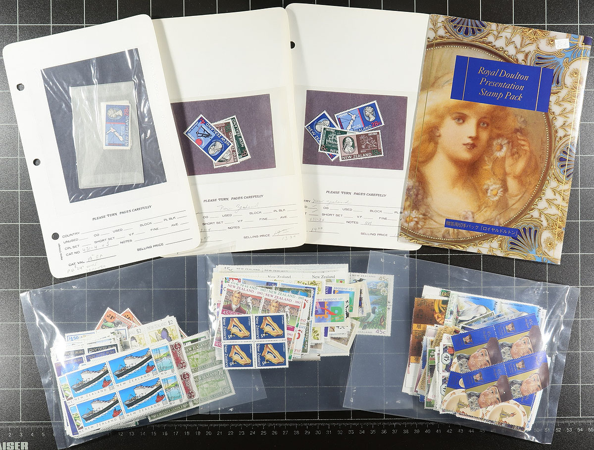 Lovely accumulation of primarily never hinged New Zealand, 1960's-1990's, containing many hundreds of stamps in glassines, dealer pages, and loose in plastic baggies. This very nice lot generally ranges from SCott #340c/1398, containing mostly blocks, sets, and partial sets, with a spot check indicating some material cataloguing $10 and up each. Owner's 2017 Scott catalogue value for the lot totals US$1,699.00 ($2,293.65 CDN), face value alone should be several hundreds of dollars. A nice lot for collectors or dealers looking for stock. Clean and very fine. Estimate =