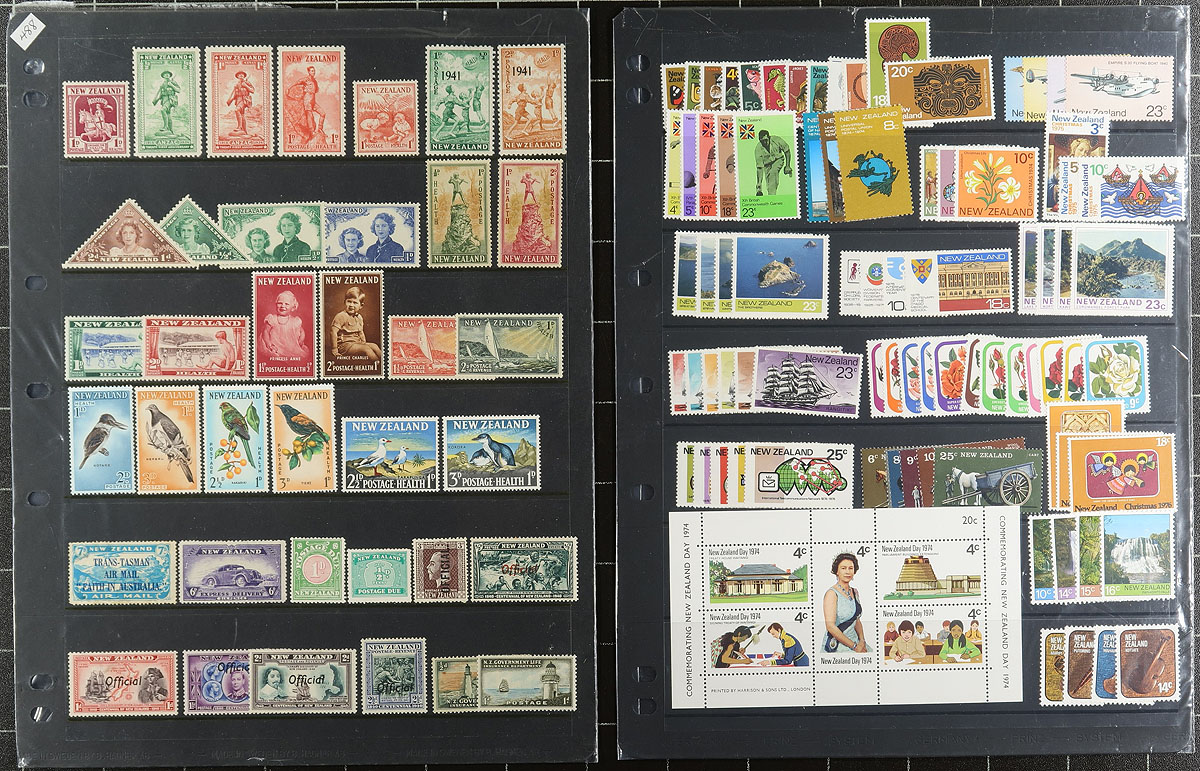 Nice collection / accumulation of primarily never hinged New Zealand, 1936-1995, containing several hundreds of stamps in roughly 30 stock pages. The lot generally ranging from Scott #219/1259, containing several sets, along with semi-postals and other back of the book issues, and a few blocks and souvenir sheets. A spot check indicated some material cataloguing $10 to $20 each, with the owner's 2013 Scott catalogue value for the lot totaling US$1,778.00 ($2,400.30 CDN). Face value alone is several hundreds of dollars. A very nice lot for the New Zealand collector, dealer looking for stock, or postage user. Clean and very fine. Estimate =