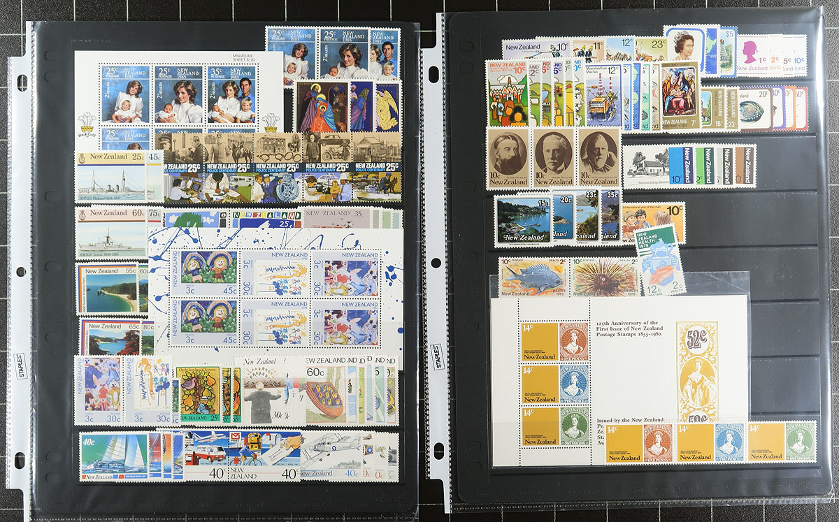 Nice collection / accumulation of primarily never hinged New Zealand, 1936-1995, containing several hundreds of stamps in roughly 30 stock pages. The lot generally ranging from Scott #219/1259, containing several sets, along with semi-postals and other back of the book issues, and a few blocks and souvenir sheets. A spot check indicated some material cataloguing $10 to $20 each, with the owner's 2013 Scott catalogue value for the lot totaling US$1,778.00 ($2,400.30 CDN). Face value alone is several hundreds of dollars. A very nice lot for the New Zealand collector, dealer looking for stock, or postage user. Clean and very fine. Estimate =